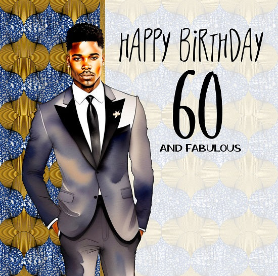 This 60 and Fabulous card is perfect for celebrating your loved one's Milestone birthday! Designed with an elegant African print accent, this card features a handsome black man celebrating one of life's greatest moments. Add an extra special touch to their special day!
