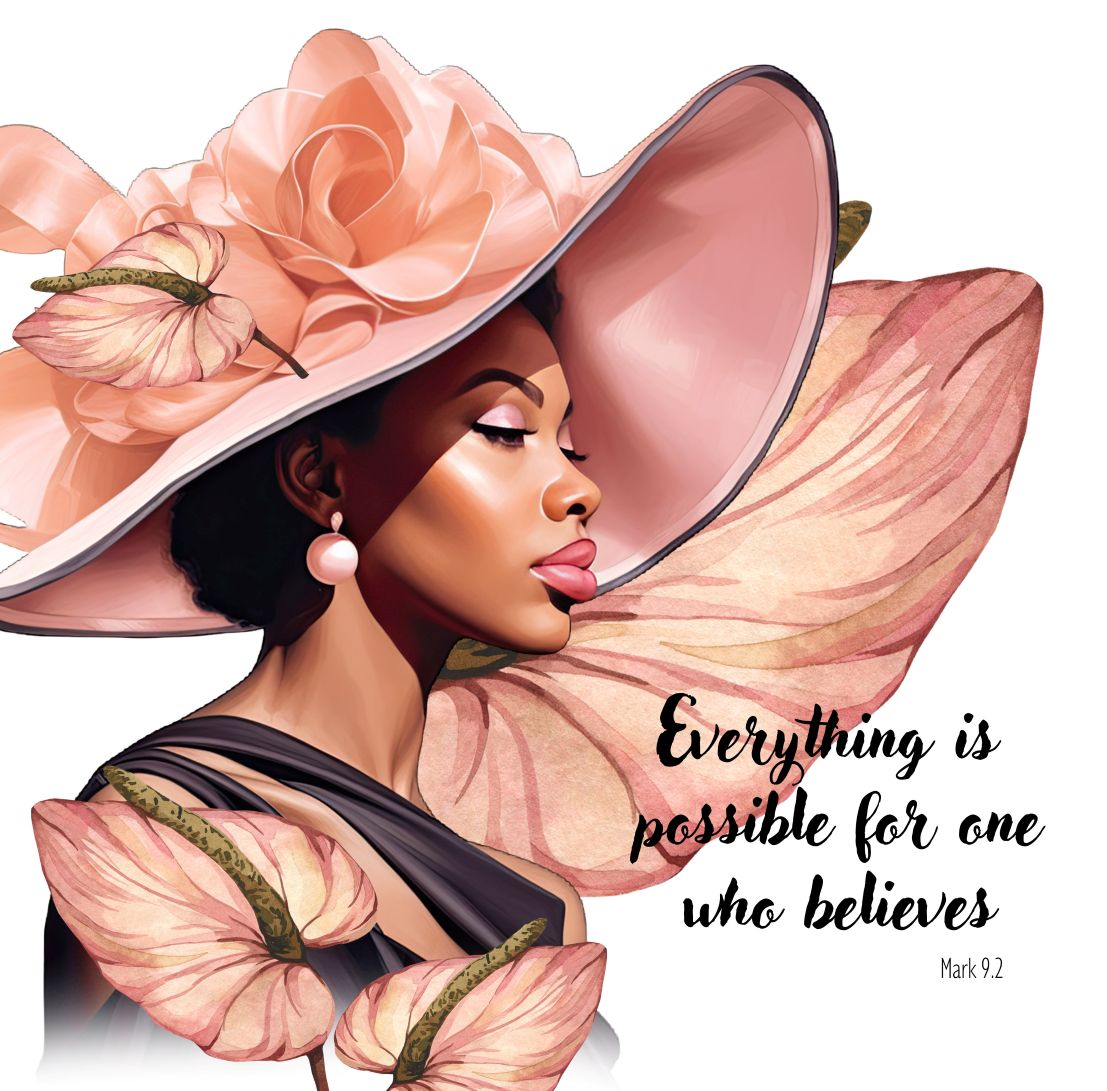 Featuring a striking illustration of a black woman of faith adorned with a pink hat, this card serves as a powerful and inspiring card for empowerment. The interior of this elegant card is left blank, allowing you to personalize your message.
