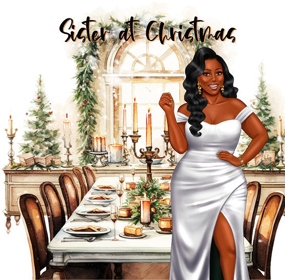 This is a beautiful Christmas card for a wonderful sister. It has a beautiful black woman on the front standing in front of a festive table.
