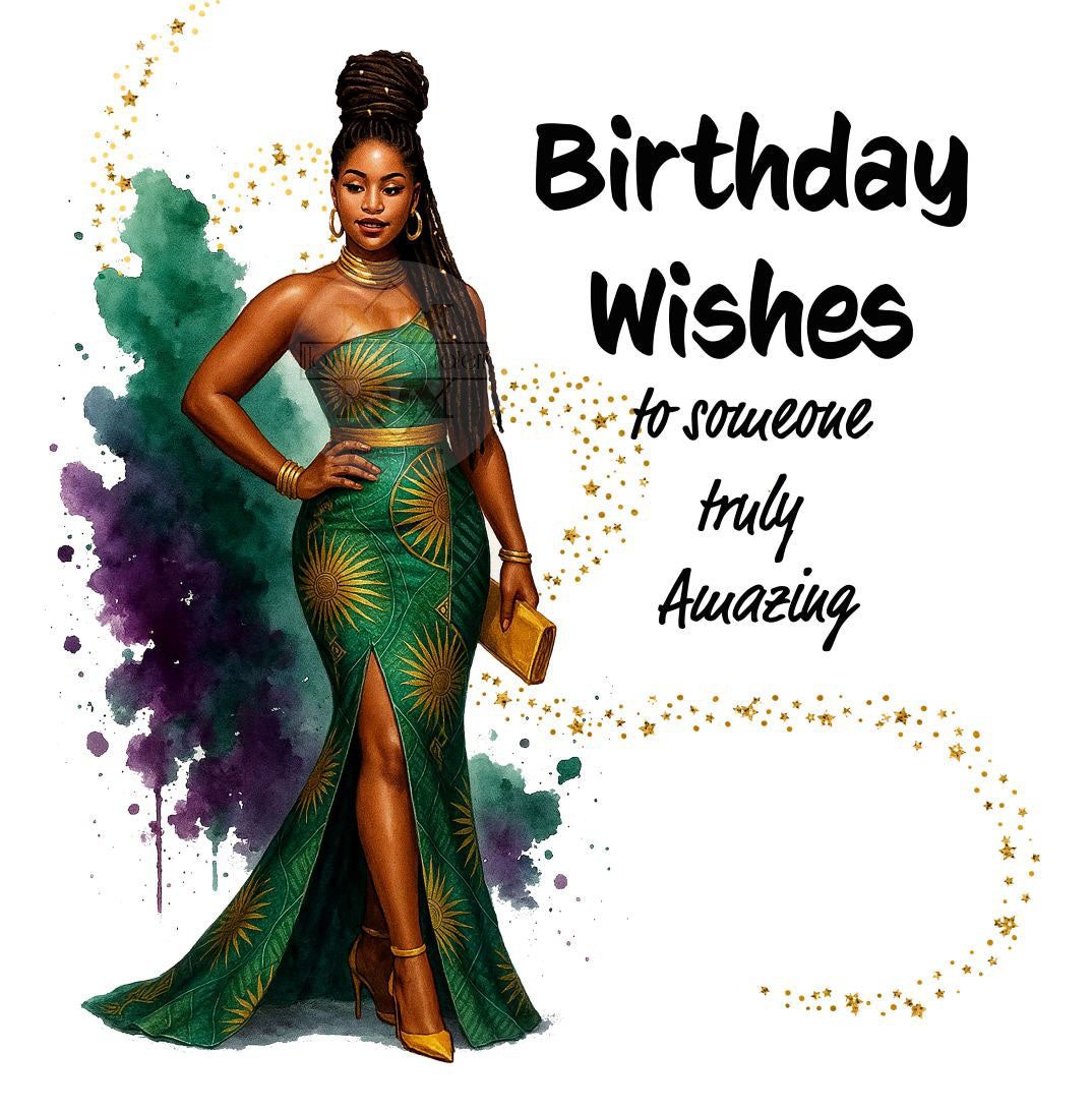 This graceful card showcases a striking black woman with flowing long locs, dressed in a vibrant African print gown, enjoying a birthday beverage. The design is rendered in a refined watercolor painting style.