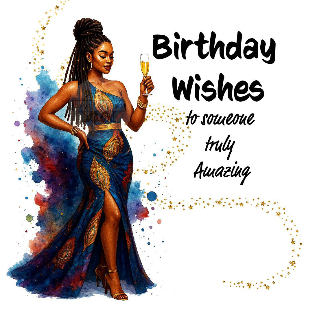 This graceful card showcases a striking black woman with flowing long locs, dressed in a vibrant African print gown, enjoying a birthday beverage. The design is rendered in a refined watercolor painting style.
