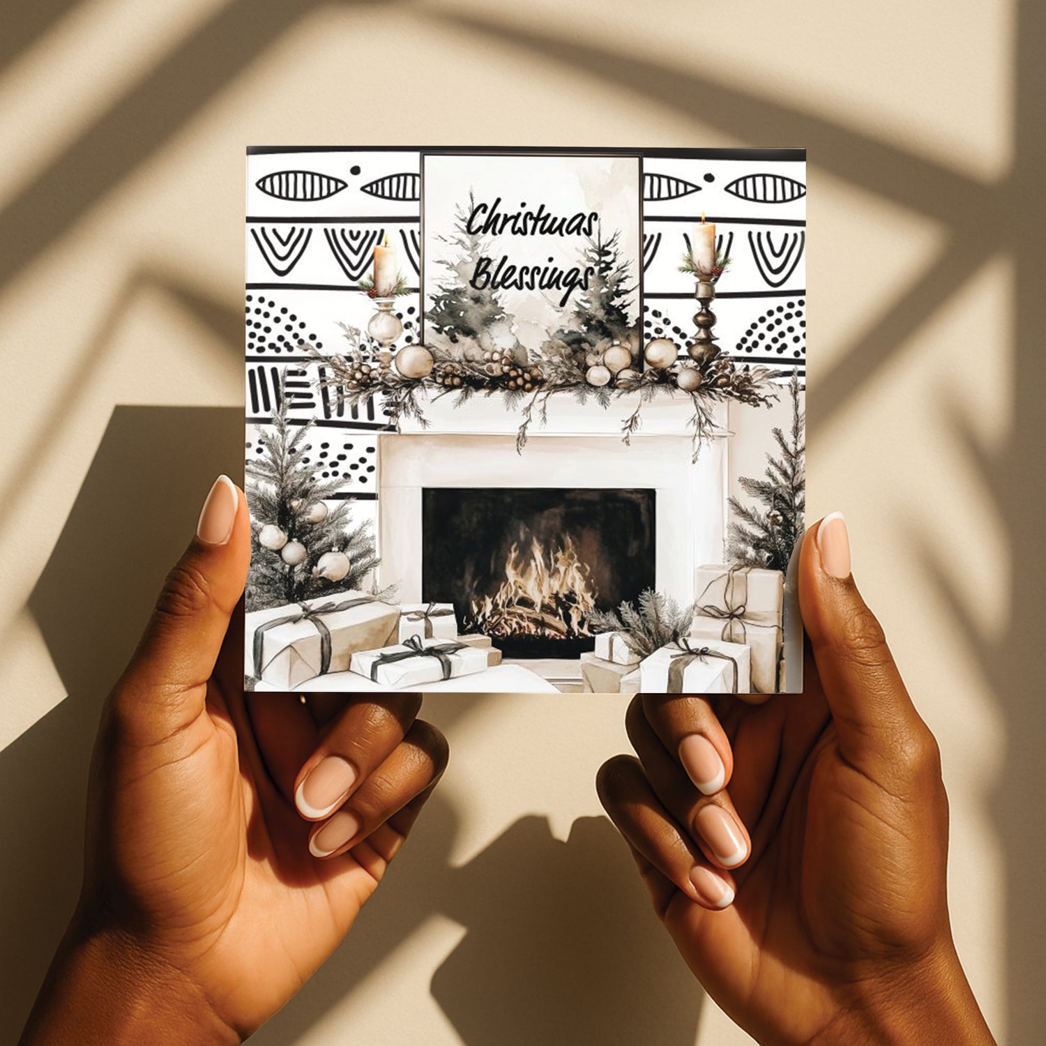 This elegant Christmas card brings together modern Afrocentric design and classic holiday comfort. A glowing fireplace sets the scene, surrounded by beautifully wrapped gifts, winter greenery, and shimmering ornaments. Above the mantle, a soft watercolor forest print reads “Christmas Blessings” — a gentle reminder of peace, gratitude, and the joy of the season.